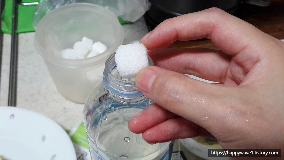 3. 녹차를 우리고 식히는 동안, 패트병 안에 각설탕 1개를 넣는다. (각설탕이 없는 사람은 설탕 2티스푼을 넣으면 ok.)