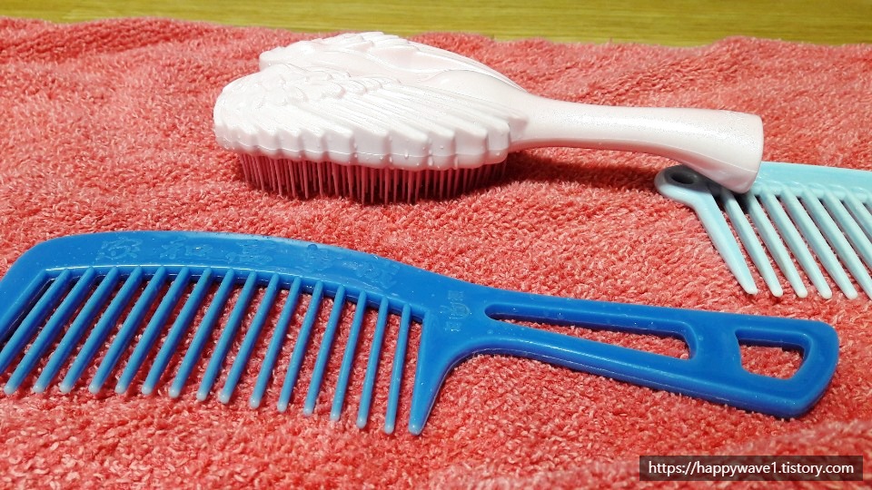 6. 마지막으로 바닥에 타월을 깔고, 빗의 물기를 자연스럽게 빼주면 머리빗 청소 제대로하기 끝~! 다만 여기서 팁한가지는, 위 사진처럼 핑크빗같은 형태의 경우는 물기가 잘 빠지도록 방향을 아래로 향해 놓아주어야 한다는 점이다. 도끼빗의 경우는 어찌하든 상관없지만...