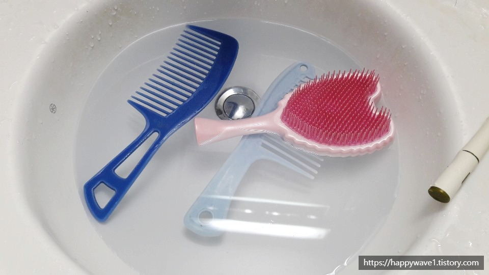 3. 그리고 그 안에 빗들을 퐁당 빠뜨려준 후 20~30분간 방치한다. 물론 이 경우 플라스틱 빗에 한해 사용가능한 방법이며, 나무빗 등은 적용할 수 없다.